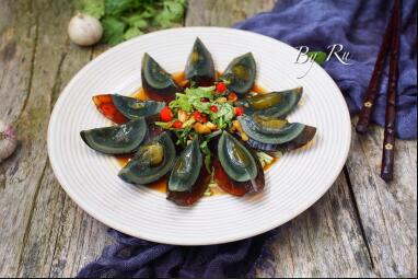 皮蛋又叫松花蛋,有許多種做法,可以單獨(dú)成為一道涼菜,也能與黃瓜小炒或是相伴成湯。通常情況下有皮蛋的菜里都會(huì)有姜、蒜、醋、辣椒等比較搶味的配料。這是因?yàn)槠さ岸嗍怯螟喌半缰频?,腌制時(shí)放入了茶葉、石灰,其中含有的有機(jī)茶酚單寧及產(chǎn)生的氫氧化鈉等物質(zhì)滲透到蛋里,加工時(shí)蛋白質(zhì)分解產(chǎn)生出一定的氨氣,使得皮蛋有一種堿澀味。